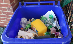 at the bottom of the container whereas the recycling bin is nearly full.